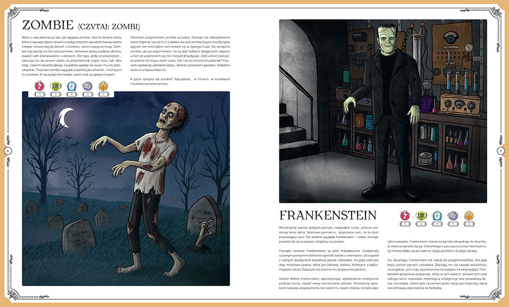 Ksi±¿ka wydana jest w du¿ym formacie, w twardej oprawie i na bardzo dobrej jako¶ci, grubszym papierze. Spodoba³ nam siê oryginalny pomys³ na ilustracje! A¿ dziewiêciu wspania³ych, nieustraszonych ilustratorów stanê³o oko w oko z potworami i przygotowa³o ich portrety. Wszystko po to, by oswoiæ strach i przekonaæ siê, ¿e nie taki potwór straszny, jak go maluj±. Piêkna, wyj±tkowa ksi±¿ka, idealna na prezent dla czytelnika w wieku od 7 do 107 lat! Doceniam j± bardzo za przystêpny, ciekawy jêzyk, interesuj±ce przedstawienie bohaterów i fascynuj±ce ciekawostki.