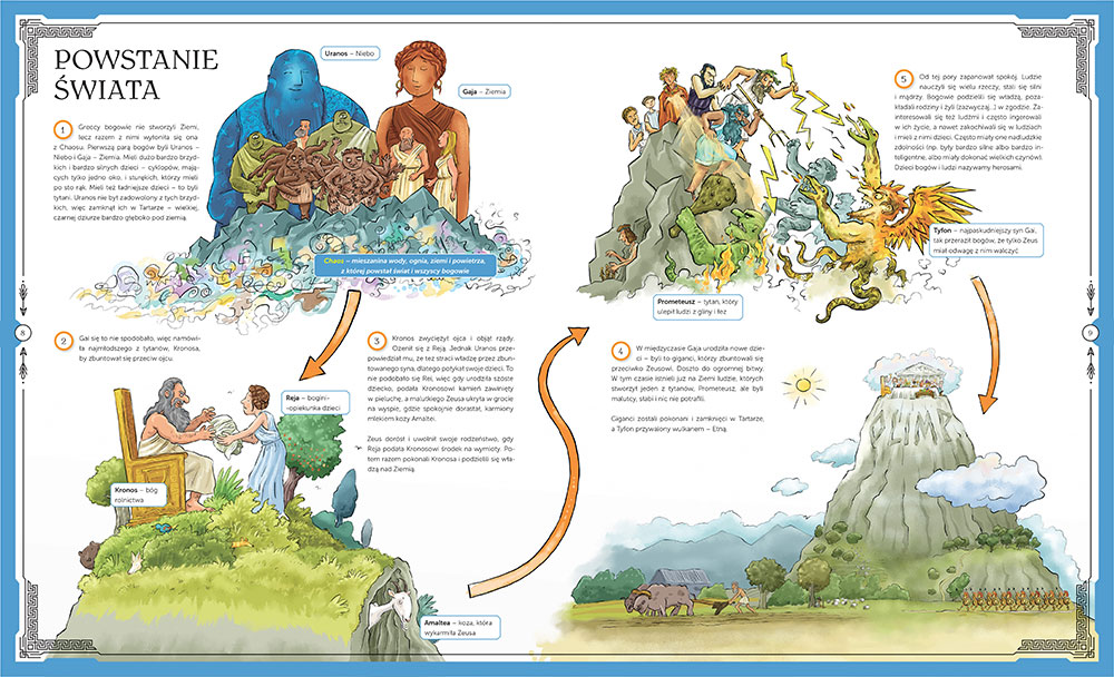 "Atlas mitologii świata dla dzieci" czyta się zupełnie inaczej, niż chociażby szkolnego Parandowskiego. Przyznaję zupełnie szczerze i bez bicia, że tamta klasyczna wersja z podstawówki niejednokrotnie strasznie mnie męczyła, nużyła dłużyznami i zawiłymi, skomplikowanymi opisami. Zaryzykuję nawet stwierdzenie, że w pewnym sensie wręcz obrzydziła mi całą kulturę helleńską i nie mogłam się doczekać, kiedy wreszcie przez nią przebrniemy. W przypadku propozycji od Wydawnictwa GREG od razu daje się odczuć, że jest to książka niezwykle przyjazna dzieciom: taka, do której zagląda się z niekłamaną przyjemnością i ekscytacją, a nie na siłę i wyłącznie z poczucia uczniowskiego obowiązku.