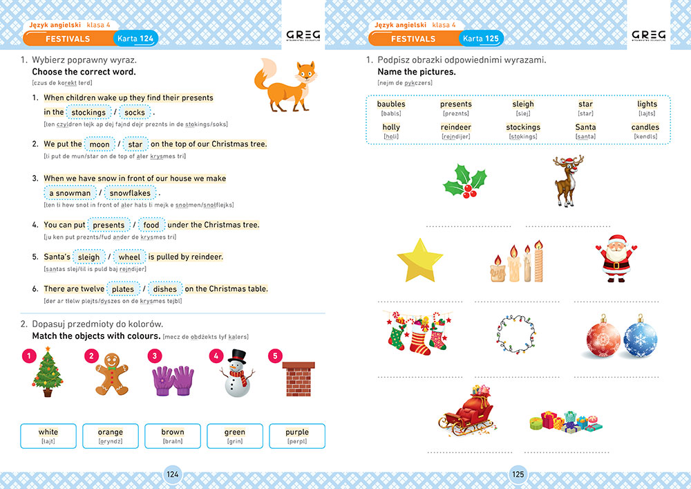 Jêzyk angielski. Karty pracy... zawieraj± æwiczenia z pe³nego zakresu tematycznego i wszystkich dzia³ów gramatycznych obowi±zuj±cych w podstawie programowej, a przy tym s± ró¿norodne i atrakcyjne dla ucznia. Niektóre z nich to specjalnie oznaczone zadania typu egzaminacyjnego, które pozwalaj± czwartoklasistom zaznajamiaæ siê z typami zadañ, jakie kiedy¶ spotkaj± na egzaminie ósmoklasisty.