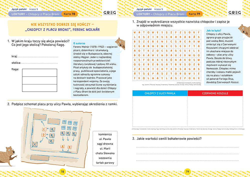 Karty pracy dla pi±toklasistów zosta³y podzielone na dwie czê¶ci - pierwsza z nich sk³ada siê zadañ dotycz±cych zagadnieñ gramatycznych obowi±zuj±cych w klasie pi±tej. Uczeñ dowie siê wszystkiego m.in. o czê¶ciach mowy i czê¶ciach zdania. Druga dotyczy czêsto omawianych na lekcjach lektur szkolnych, takich jak W pustyni i w puszczy czy Katarynka.