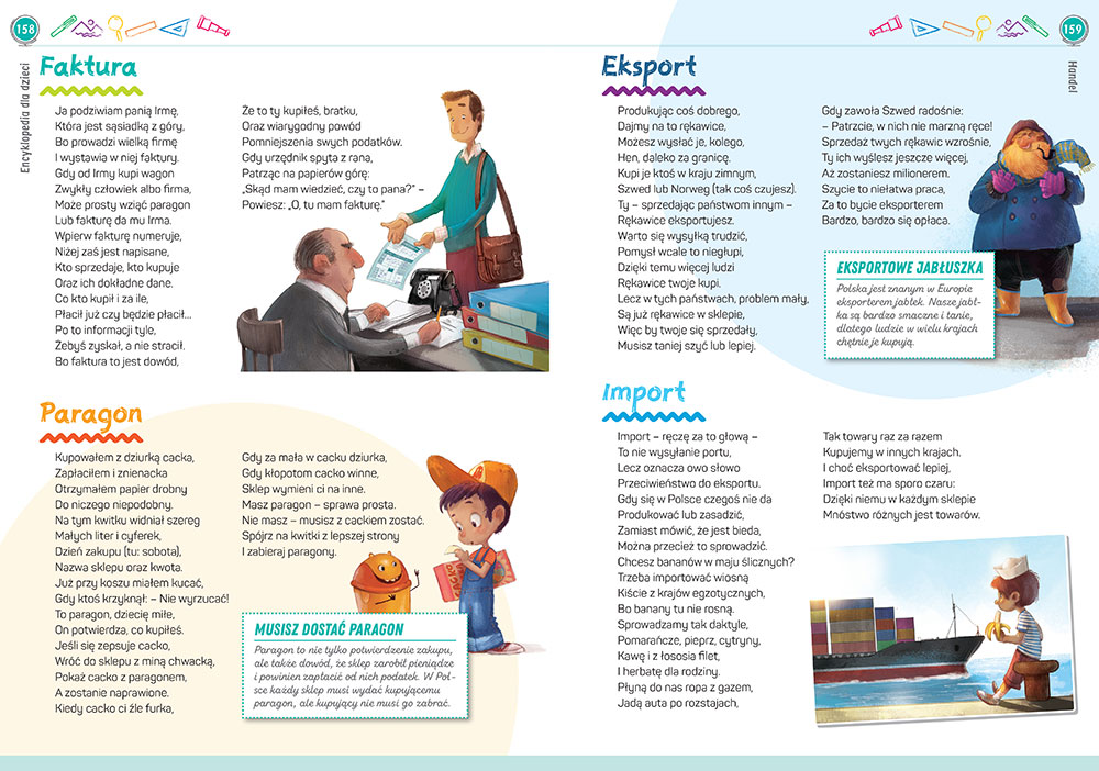 (...) to bardzo przystępnie i oryginalnie przygotowane kompendium, wypełnione mnóstwem ilustracji i krótkich rymowanek (...) Bardzo pozytywnie zaskoczyła nas obszerna część dotycząca pracy, bankowości, handlu, czy podatków. To bardzo ważne i potrzebne tematy, dlatego cieszę się, że dzieci dowiedzą się jakie są rodzaje umów o pracę, czym jest renta, kredyt, popyt, reklamacja, faktura, eksport, gwarancja i wiele innych z pozoru trudnych dla dzieci tematów, podanych w bardzo czytelny, zrozumiały sposób już dla kilkulatka (...) Książka wydana jest w dużym formacie, twardej oprawie i będzie interesującą propozycją dla każdego ciekawego świata bystrzaka!