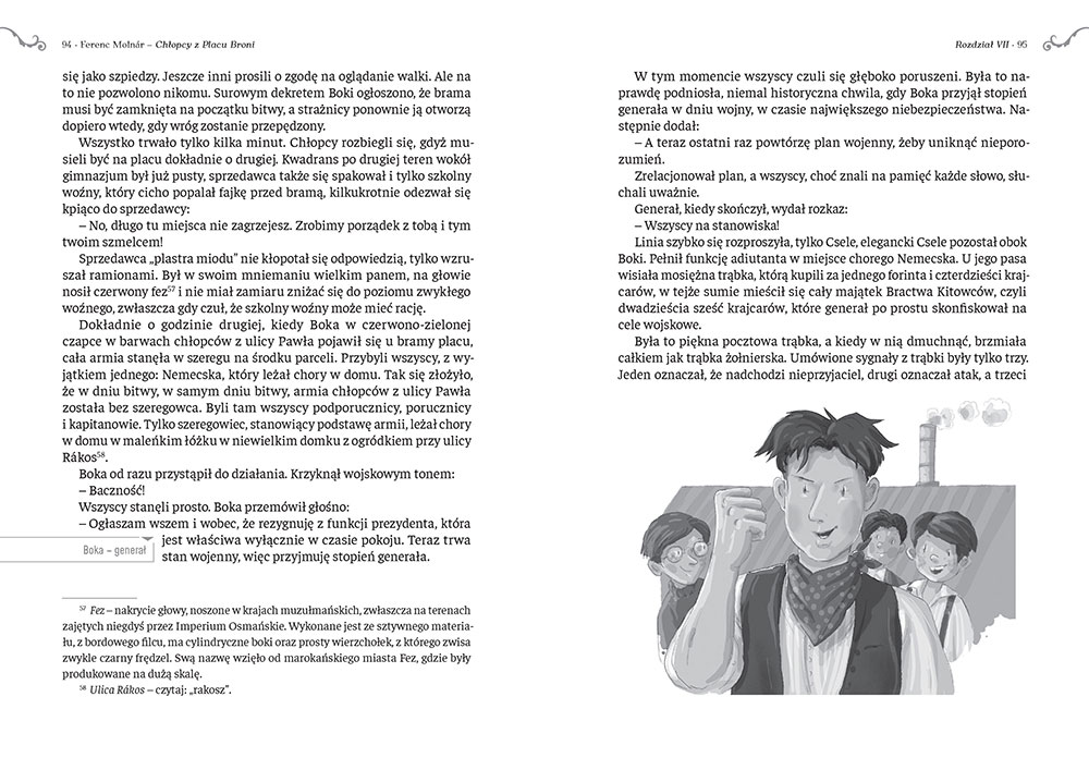Wydanie Chłopców z Placu Broni od Wydawnictwa Greg to nie tylko nowe tłumaczenie i rzetelne opracowanie, ale także wyjątkowe ilustracje Mikołaja Kamlera. Książkę wyróżnia oryginalny zapis imion, nazwisk i nazw miejscowych oraz towarzyszące mu przypisy z zapisem wymowy, a także nagrania dostępne online, dzięki którym można usłyszeć, jak nazwy własne brzmią po węgiersku.