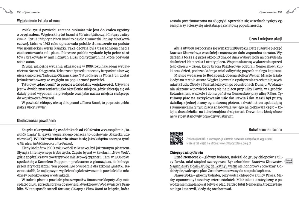 Wydanie Chłopców z Placu Broni kompletne bez skrótów i cięć w treści. W tym wydaniu znajdziesz odpowiedzi na pytania z podręcznika - „pewniak na teście”, czyli wskazanie zagadnień, które zwykle pojawiają się w pytaniach z danej lektury we wszelkich testach sprawdzających wiedzę, a także w podręcznikach i na klasówkach. Książka zawiera pełen tekst lektury. Na końcu książki zamieszczono opracowanie, w którym znajduje się bardzo szczegółowe streszczenie oraz drugie skrócone, ułatwiające szybkie przygotowanie się przed lekcją. Opracowanie zawiera ponadto plan wydarzeń, wnikliwie wyjaśnioną problematykę oraz szerokie charakterystyki bohaterów.