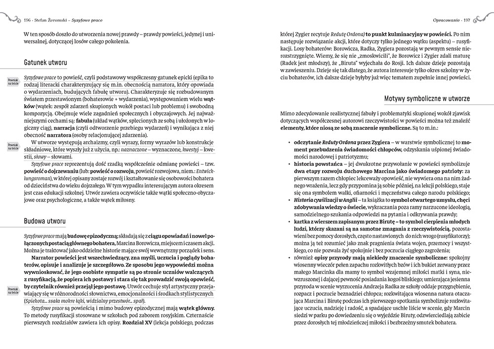 Wydanie Syzyfowych prac kompletne bez skrótów i cięć w treści. W tym wydaniu znajdziesz odpowiedzi na pytania z podręcznika - „pewniak na teście”, czyli wskazanie zagadnień, które zwykle pojawiają się w pytaniach z danej lektury we wszelkich testach sprawdzających wiedzę, a także w podręcznikach i na klasówkach. Książka zawiera pełen tekst lektury. Na końcu książki zamieszczono opracowanie, w którym znajduje się bardzo szczegółowe streszczenie oraz drugie skrócone, ułatwiające szybkie przygotowanie się przed lekcją. Opracowanie zawiera ponadto plan wydarzeń, wnikliwie wyjaśnioną problematykę oraz szerokie charakterystyki bohaterów.
