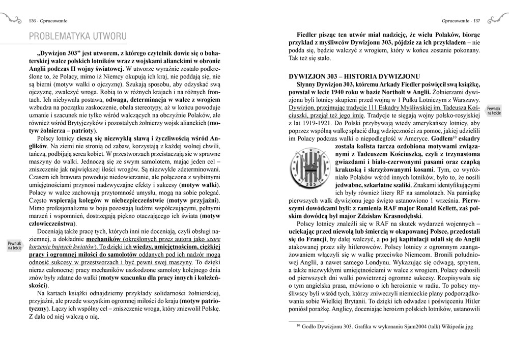Najnowsza edycja Dywizjonu 303 Arkadego Fiedlera zawiera pełne opracowanie, a w nim wszystkie informacje wymagane na lekcjach, dokładne streszczenie, charakterystyki bohaterów, problematyka, słowniczek użytych w powieści terminów. Znaczek „pewniak na teście” wskazuje szczególnie istotne treści, które zapewne pojawią się na sprawdzianach czy testach. Archiwalne zdjęcia stanowią dodatkowy atut książki.