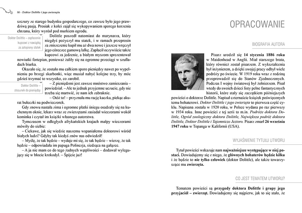 Wydanie Doktora Dolittle i jego zwierząt kompletne bez skrótów i cięć w treści. W tym wydaniu znajdziesz odpowiedzi na pytania z podręcznika - „pewniak na teście”, czyli wskazanie zagadnień, które zwykle pojawiają się w pytaniach z danej lektury we wszelkich testach sprawdzających wiedzę, a także w podręcznikach i na klasówkach. Książka zawiera pełen tekst lektury. Na końcu książki zamieszczono opracowanie, w którym znajduje się bardzo szczegółowe streszczenie oraz drugie skrócone, ułatwiające szybkie przygotowanie się przed lekcją. Opracowanie zawiera ponadto plan wydarzeń, wnikliwie wyjaśnioną problematykę oraz szerokie charakterystyki bohaterów.