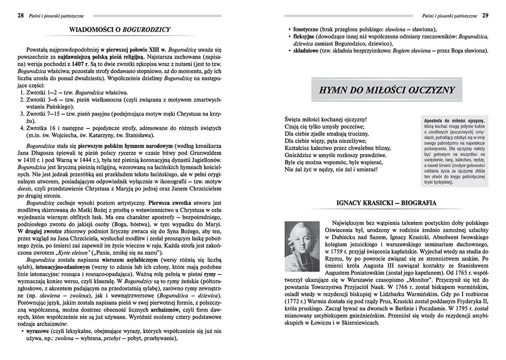 Mazurek... został omówiony wers po wersie, przedstawiono też jego historię, okoliczności powstania i kontekst historyczny, natomiast znaczki „pewniak na teście” wskazują wiadomości niezbędne na sprawdzianach. Również pozostałe utwory posiadają dokładne, odpowiadające wymaganiom uczniów szkoły podstawowej opracowania.