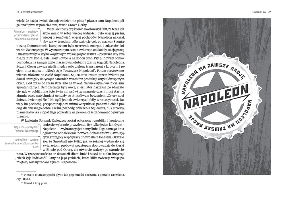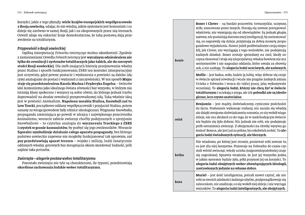 Wydanie Folwarku zwierzęcego kompletne bez skrótów i cięć w treści. W tym wydaniu znajdziesz odpowiedzi na pytania z podręcznika - „pewniak na teście”, czyli wskazanie zagadnień, które zwykle pojawiają się w pytaniach z danej lektury we wszelkich testach sprawdzających wiedzę, a także w podręcznikach i na klasówkach. Książka zawiera pełen tekst lektury. Na końcu książki zamieszczono opracowanie, w którym znajduje się bardzo szczegółowe streszczenie oraz drugie skrócone, ułatwiające szybkie przygotowanie się przed lekcją. Opracowanie zawiera ponadto plan wydarzeń, wnikliwie wyjaśnioną problematykę oraz szerokie charakterystyki bohaterów.