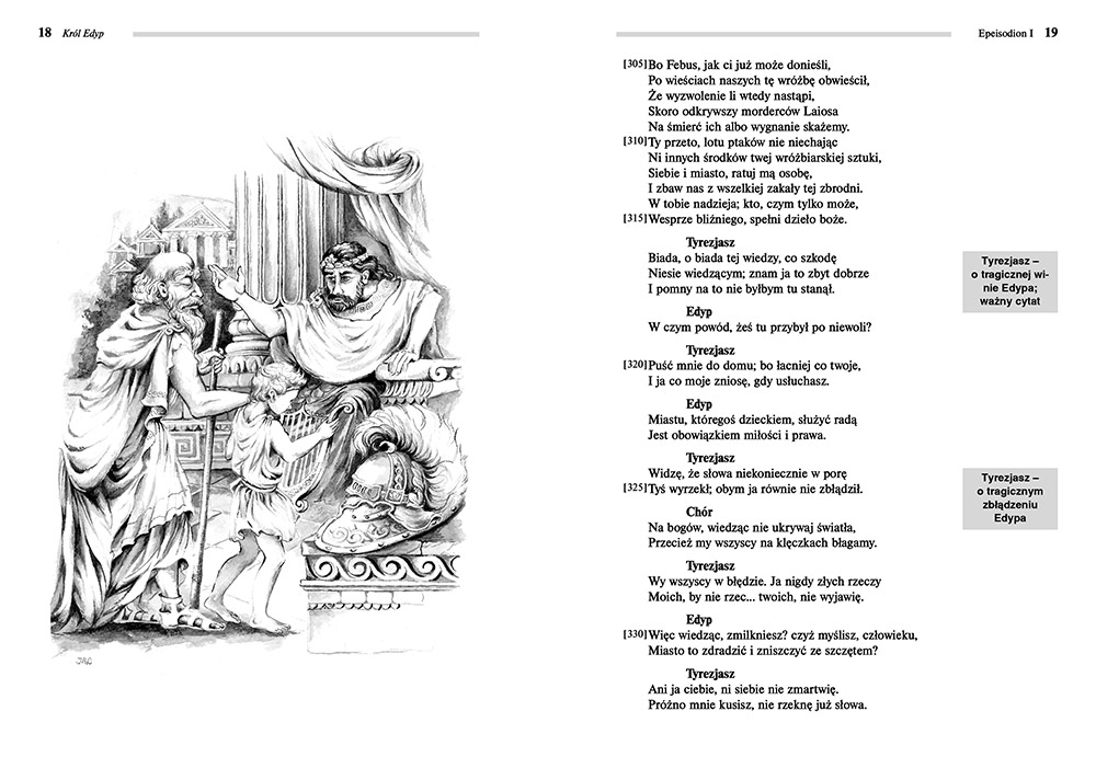 Wydanie Króla Edypa kompletne bez skrótów i cięć w treści. W tym wydaniu znajdziesz odpowiedzi na pytania z podręcznika - „pewniak na teście”, czyli wskazanie zagadnień, które zwykle pojawiają się w pytaniach z danej lektury we wszelkich testach sprawdzających wiedzę, a także w podręcznikach i na klasówkach. Książka zawiera pełen tekst lektury. Na końcu książki zamieszczono opracowanie, w którym znajduje się bardzo szczegółowe streszczenie oraz drugie skrócone, ułatwiające szybkie przygotowanie się przed lekcją. Opracowanie zawiera ponadto plan wydarzeń, wnikliwie wyjaśnioną problematykę oraz szerokie charakterystyki bohaterów.