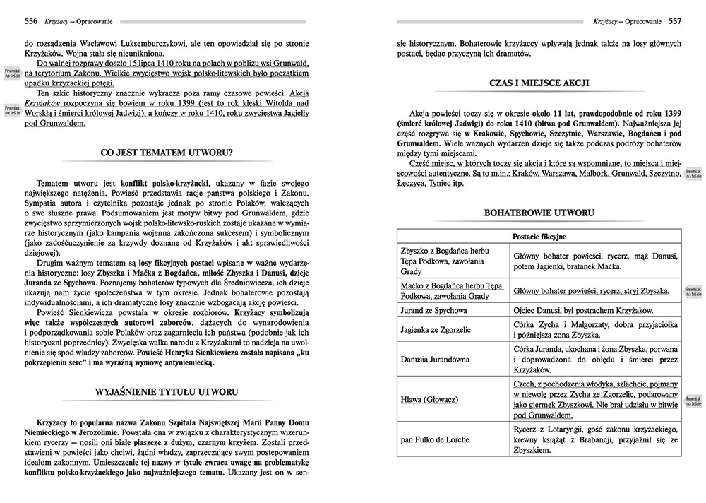 Postaci przedstawione w książce są niezwykle barwne, charyzmatyczne i wyraziste. I nie piszę tu tylko o głównych bohaterach, ale także o postaciach pojawiających się tylko przez chwilę. Autor dobrze przedstawił klimat tamtych czasów, mamy sporo archaizmów i opisów zwyczajów panujących w średniowieczu (...) "Krzyżacy" z serii Lektura z opracowaniem to doskonała propozycja dla uczniów. Znajdziemy tu pełną wersję lektury oraz szczegółowe opracowanie (...). Bardzo pomocne są liczne komentarze umieszczone na marginesie tekstu, które wskazują najważniejsze fragmenty utworu. Bez tego czytając powieść musielibyśmy nieustannie przerywać i robić notatki, aby później móc szybko odnaleźć interesujący nas fragment.