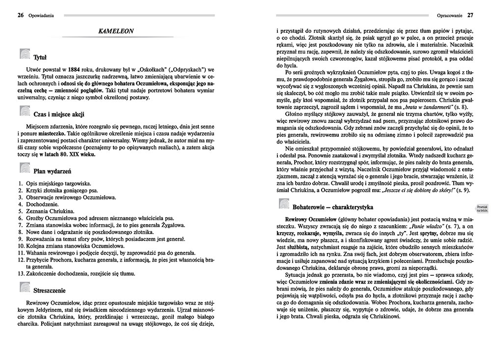 Wydanie Śmierci urzędnika, Kameleona i Człowieka w futeralekompletne bez skrótów i cięć w treści. W tym wydaniu znajdziesz odpowiedzi na pytania z podręcznika - „pewniak na teście”, czyli wskazanie zagadnień, które zwykle pojawiają się w pytaniach z danej lektury we wszelkich testach sprawdzających wiedzę, a także w podręcznikach i na klasówkach. Książka zawiera pełen tekst lektury. Na końcu książki zamieszczono opracowanie, w którym znajduje się bardzo szczegółowe streszczenie oraz drugie skrócone, ułatwiające szybkie przygotowanie się przed lekcją. Opracowanie zawiera ponadto plan wydarzeń, wnikliwie wyjaśnioną problematykę oraz szerokie charakterystyki bohaterów.