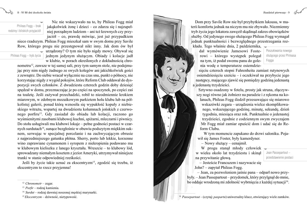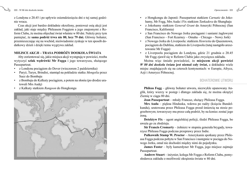Wydanie W 80 dni dookoła świata kompletne bez skrótów i cięć w treści. W tym wydaniu znajdziesz odpowiedzi na pytania z podręcznika - „pewniak na teście”, czyli wskazanie zagadnień, które zwykle pojawiają się w pytaniach z danej lektury we wszelkich testach sprawdzających wiedzę, a także w podręcznikach i na klasówkach. Książka zawiera pełen tekst lektury. Na końcu książki zamieszczono opracowanie, w którym znajduje się bardzo szczegółowe streszczenie oraz drugie skrócone, ułatwiające szybkie przygotowanie się przed lekcją. Opracowanie zawiera ponadto plan wydarzeń, wnikliwie wyjaśnioną problematykę oraz szerokie charakterystyki bohaterów.