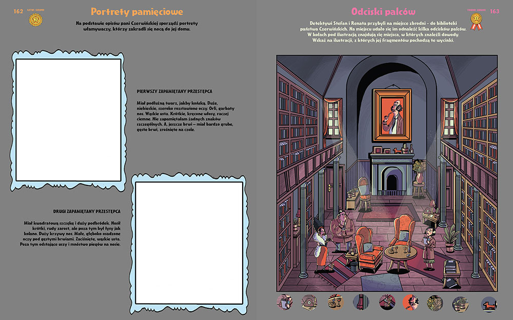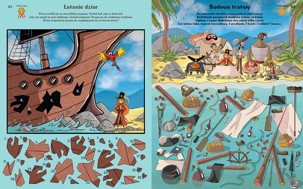 Można tu znaleźć wszystkie typy zabaw ulubione przez dzieci - labirynty, szukanie różnic, łączenie par, dobieranie pasujących elementów, rysowanie i kolorowanie, a także krzyżówki, łamigłówki logiczne i szyfry. Zadania prezentują trzy stopnie trudności, a więc każde dziecko znajdzie coś dla siebie. A wszystko to w oszałamiającej rozmachem i kolorami oprawie graficznej przygotowanej przez niezrównaną graficzkę, Nikolę Kucharską.