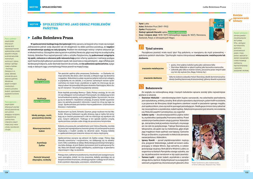 Ksi±¿ka zosta³a dostosowana do za³o¿eñ nowej podstawy programowej, która k³adzie szczególny nacisk na to, by uczeñ potrafi³ swobodnie operowaæ motywami literackimi, zestawiaæ ze sob± lektury, dostrzegaæ nawi±zania miêdzy nimi i budowaæ siatkê skojarzeñ. Z tego wzglêdu omówienia lektur w niej nie s± u³o¿one chronologicznie, lecz zebrane w grupy wed³ug motywów. Omówiono wszystkie najbardziej popularne w szkolnej praktyce motywy, takie jak bunt, wady narodowe, matka, ojciec, rewolucja, wojna, ¶mieræ i wiele innych, a g³ówny nacisk zosta³ po³o¿ony na realizacjê danego motywu w utworze. Rzecz jasna nie zapomniano te¿ o streszczeniach, omówieniu tytu³u, czasu i miejsca akcji oraz najwa¿niejszych bohaterów. Atutem s± te¿ dok³adniejsze, bardziej szczegó³owe streszczenia dostêpne pod kodami QR. Nowoczesna oprawa graficzna u³atwia pracê z ksi±¿k±.