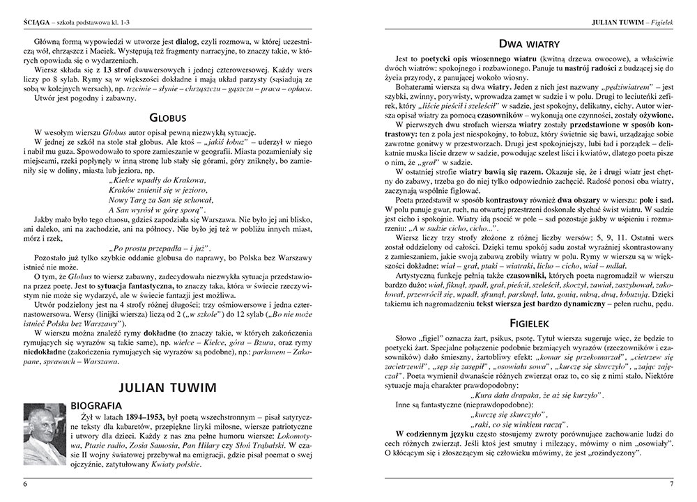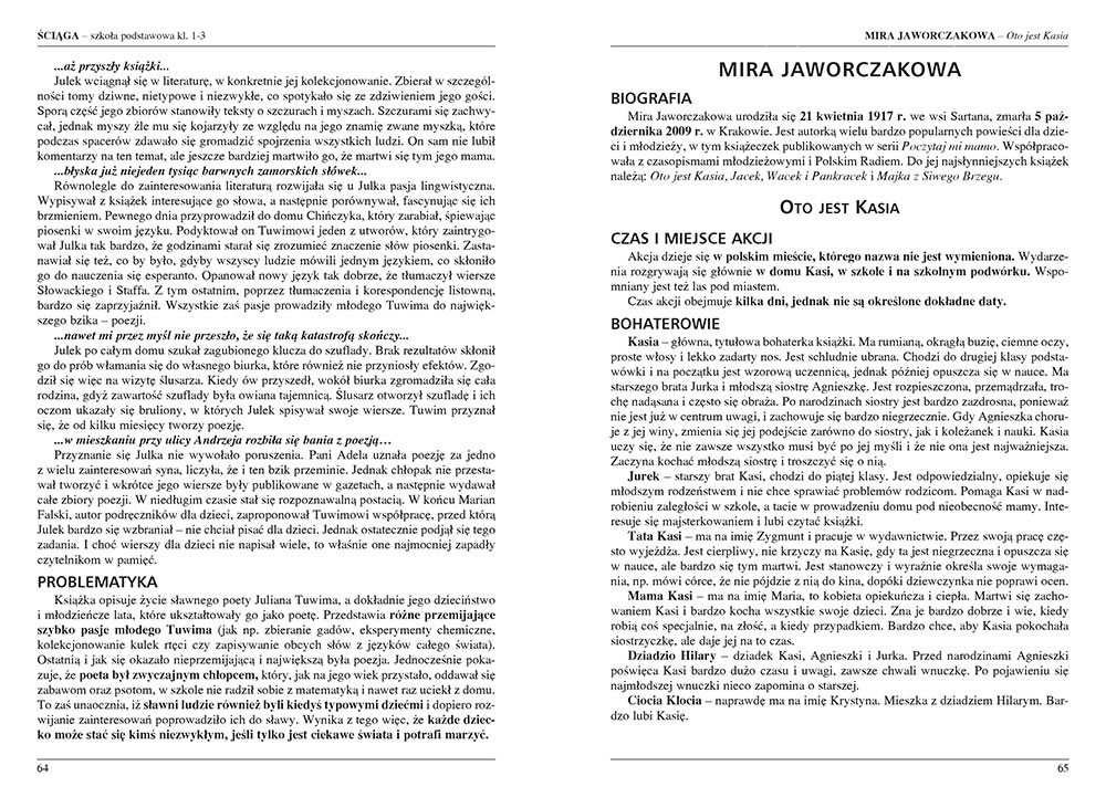 Znajdują się tutaj dokładne streszczenia, charakterystyki bohaterów, plany wydarzeń, problematyki, a także krótkie notki biograficzne autorów. Zadbano o to, by nie zniechęcić małych uczniów do nauki, dlatego wszystkie teksty są napisane bardzo prostym, zrozumiałym językiem, bez użycia trudnych terminów i pojęć, krótkie i treściwe, by dziecku łatwo było zapamiętać wszystkie wymagane informacje.