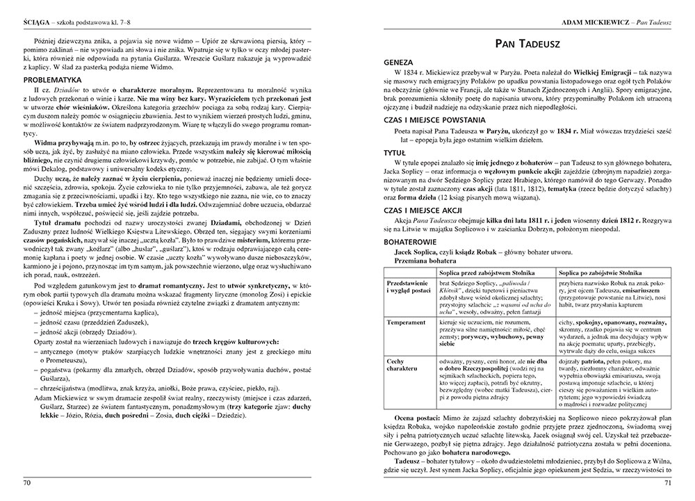 Ściąga przeznaczona dla klas 7-8 zawiera opracowania wszystkich obowiązkowych w tych dwóch latach nauki lektur i wierszy. Można tu znaleźć biografię autora, plan wydarzeń, dokładne charakterystyki bohaterów, szczegółowe streszczenia i wyczerpującą problematykę każdego utworu, a w przypadku wierszy także omówienia ich budowy. Wszystko przedstawiono przystępnym językiem, który sprawia, że praca z książką jest łatwa i przyjemna.